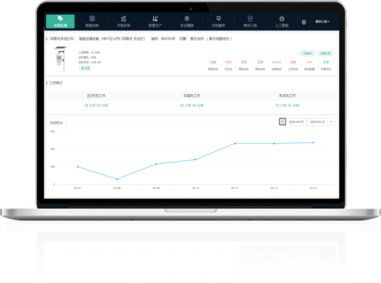 云平臺或APP上實時查看設備分布點位、工作狀態、電池電量等,進行功能設置等設備管理操作;可視化顯示害蟲圖片、種類數量、變化趨勢,智能分析蟲情報告,基于農業知識圖譜推薦蟲害防治方法。